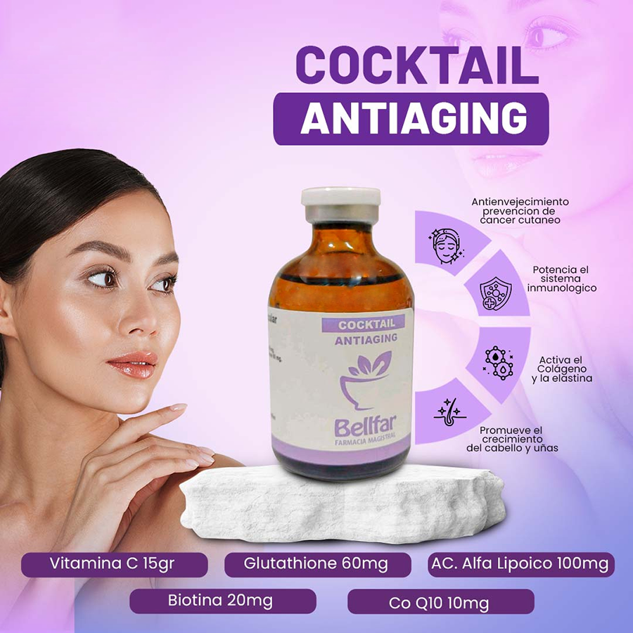 El Cocktail Antiaging es un tratamiento dermocosmético avanzado diseñado para combatir los signos del envejecimiento cutáneo y mejorar visiblemente la calidad de la piel. Su formulación combina activos revitalizantes que ayudan a estimular la regeneración celular, mejorar la elasticidad, hidratar en profundidad y aportar luminosidad.